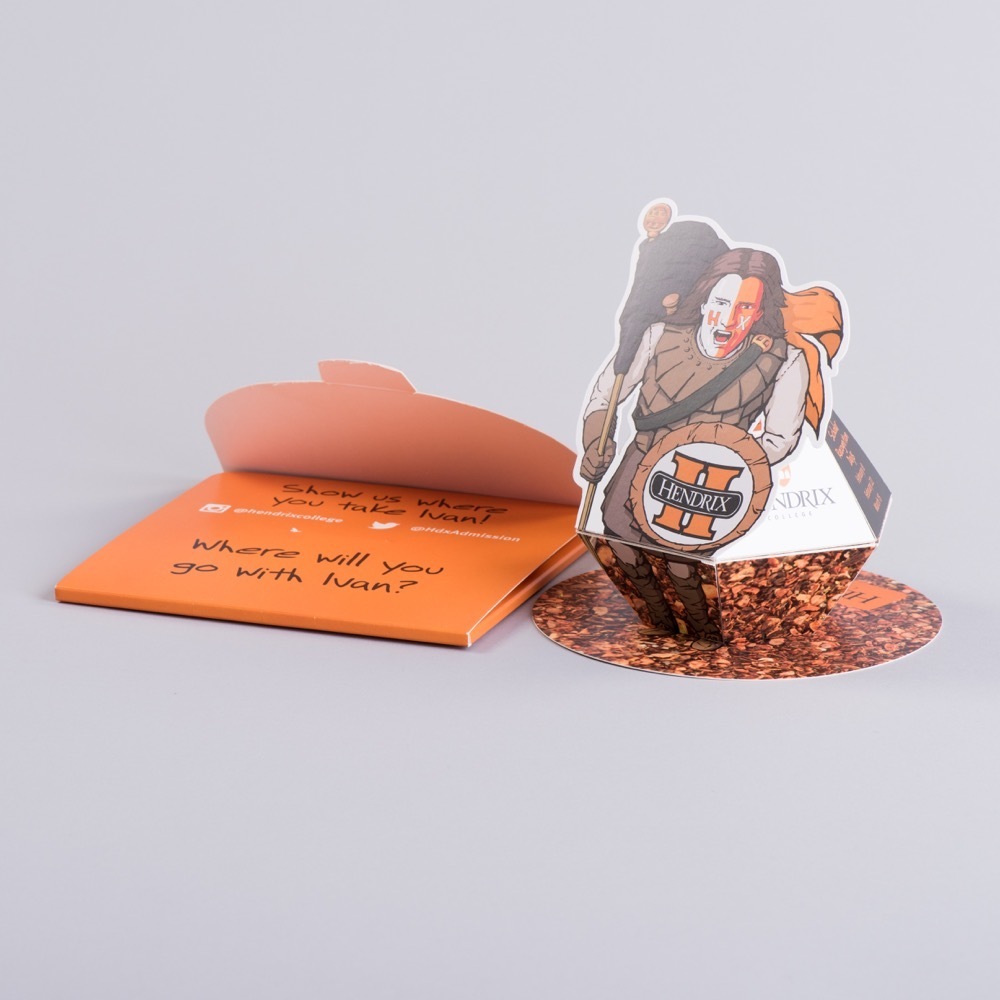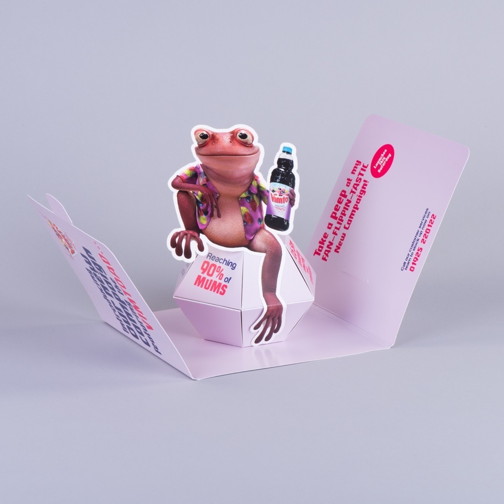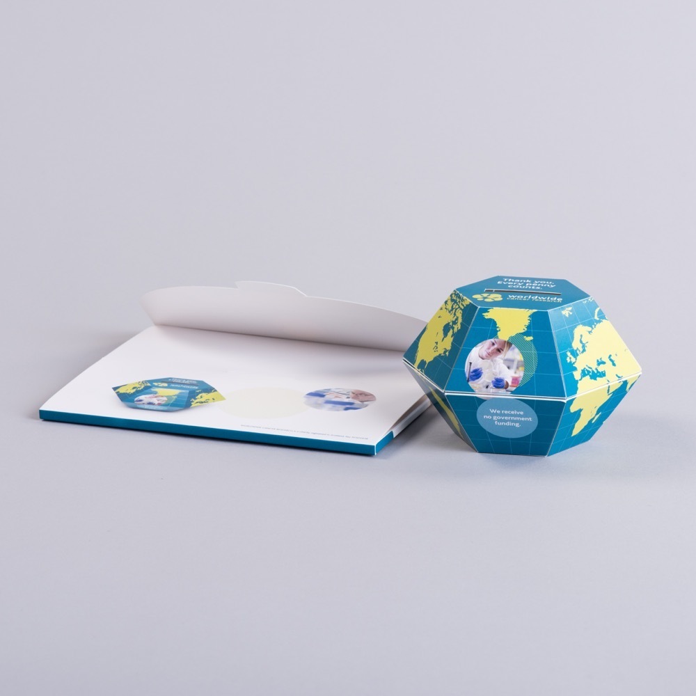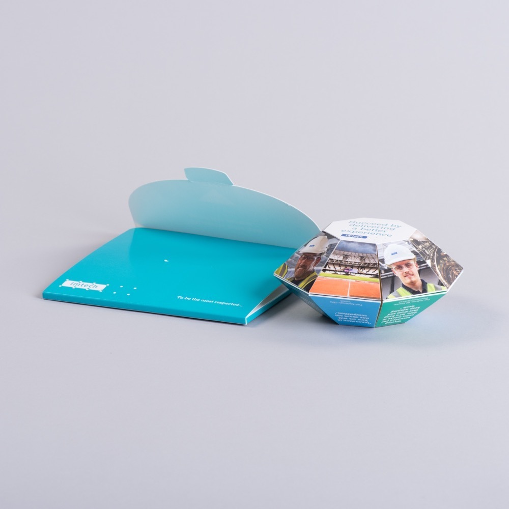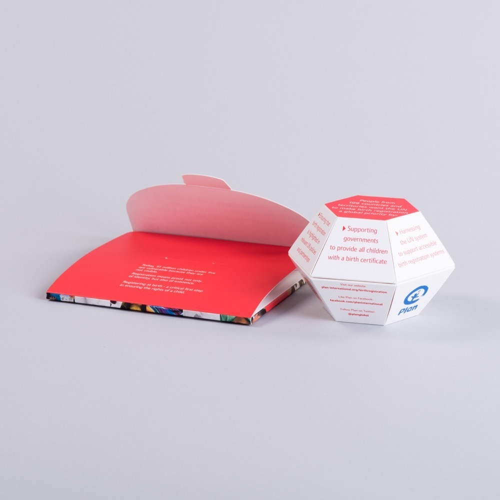 The pop up ball, also known as the pop up hex or kallapsiball is a very popular and effective direct mail idea. Mailing out flat, once opened the mailer pops into a hexagonal ball shape, with your branding on all sides. The pop up ball can be used as a desk pen holder once opened, simply by introducing small round holes in the top section. Some customers introduce a calendar into their design adding another use and encouraging retention.